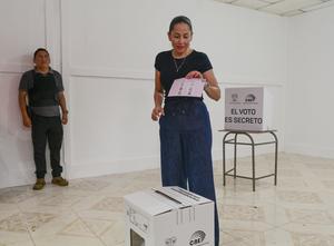 (250413) -- CANUTO, 13 abril, 2025 (Xinhua) -- La candidata de izquierda a la Presidencia de Ecuador, Luisa González (d), del movimiento Revolución Ciudadana (RC), emite su voto en la Unidad Educativa Carlos Pomerio Zambrano, en Canuto, en la provincia de Manabí, Ecuador, el 13 de abril de 2025. González ejerció el domingo su voto en la segunda vuelta de las elecciones presidenciales, en las que se enfrenta al actual mandatario y candidato a la reelección, Daniel Noboa. (Xinhua/Str) (rl) (oa) (ah)