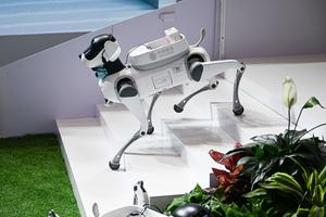 (250414) -- HAIKOU, 14 abril, 2025 (Xinhua) -- Un perro robot carga medicinas en la V Exposición Internacional de Productos...