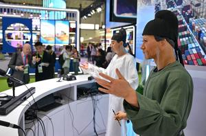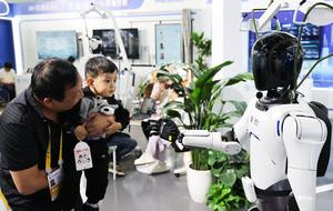 (250414) -- HAIKOU, 14 abril, 2025 (Xinhua) -- Un niño interactúa con un robot en la V Exposición Internacional de...