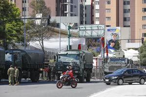 (250414) -- QUITO, 14 abril, 2025 (Xinhua) -- Una persona circula en una motocicleta junto a vehículos militares frente al...