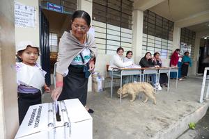 (250413) -- OTAVALO, 13 abril, 2025 (Xinhua) -- Una mujer indígena emite su voto en un colegio electoral en la...