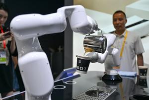 (250414) -- HAIKOU, 14 abril, 2025 (Xinhua) -- Imagen del 13 de abril de 2025 de un robot preparando café...