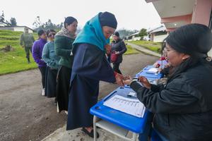 (250413) -- OTAVALO, 13 abril, 2025 (Xinhua) -- Mujeres indígenas se forman para emitir su voto en un colegio electoral...