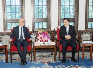 (250414) -- BEIJING, 14 abril, 2025 (Xinhua) -- El presidente de la Agencia de Noticias Xinhua, Fu Hua, se reúne...