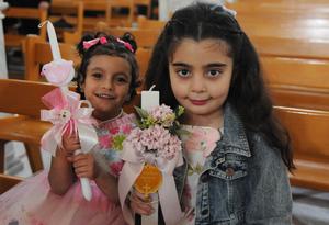 (250414) -- DAMASCO, 14 abril, 2025 (Xinhua) -- Imagen del 13 de abril de 2025 de niñas sosteniendo velas decoradas...