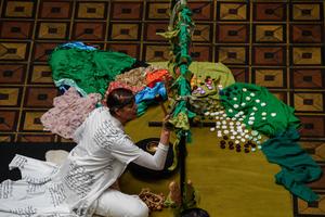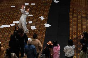 (250412) -- SANTIAGO, 12 abril, 2025 (Xinhua) -- Una artista realiza una presentación durante la "Ruta de Gabriela" en el...