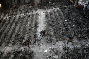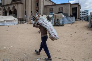 (250412) -- GAZA, 12 abril, 2025 (Xinhua) -- Imagen del 11 de abril de 2025 de un palestino desplazado transportando...