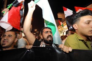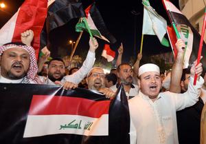 (250412) -- BAGDAD, 12 abril, 2025 (Xinhua) -- Imagen del 11 de abril de 2025 de personas sosteniendo pancartas y...