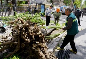 (250412) -- BEIJING, 12 abril, 2025 (Xinhua) -- Trabajadores laboran para retirar los árboles caídos y arrancados de raíz por...