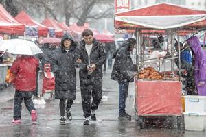 (250412) -- BEIJING, 12 abril, 2025 (Xinhua) -- Personas visitan un mercado en medio de la nieve, en Qiqihar, en...