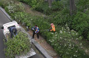 (250412) -- BEIJING, 12 abril, 2025 (Xinhua) -- Trabajadores retiran ramas caídas por los fuertes vientos, en Beijing, capital de...