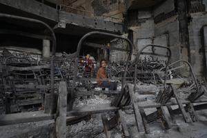 (250412) -- GAZA, 12 abril, 2025 (Xinhua) -- Imagen del 11 de abril de 2025 de niñas palestinas desplazadas vistas...