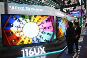 (250416) -- GUANGZHOU, 16 abril, 2025 (Xinhua) -- Visitantes observan una televisión de gran tamaño en la zona de exposición de productos de vida inteligente durante la 137ª edición de la Feria de Importación y Exportación de China, en Guangzhou, en la provincia de Guangdong, en el sur de China, el 16 de abril de 2025. La 137ª edición de la Feria de Importación y Exportación de China, también conocida como la Feria de Cantón, se inauguró el martes, con el número de expositores de exportación superando los 30.000 por primera vez en la historia de este famoso evento. Productos que reflejan el concepto de innovación ecológica, incluidos dispositivos inteligentes de ahorro de energía y productos tecnológicos ecológicos, han ganado el favor de los comerciantes extranjeros durante la feria. (Xinhua/Deng Hua) (ah) (ra) (vf)