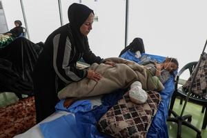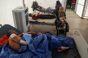(250415) -- GAZA, 15 abril, 2025 (Xinhua) -- Palestinos evacuados del Hospital Arabe Al-Ahli reciben tratamiento en el hospital de...