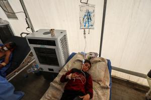 (250415) -- GAZA, 15 abril, 2025 (Xinhua) -- Un niño palestino evacuado del Hospital Arabe Al-Ahli recibe tratamiento en el...