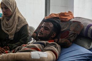 (250415) -- GAZA, 15 abril, 2025 (Xinhua) -- Un hombre palestino evacuado del Hospital Arabe Al-Ahli recibe tratamiento en el...