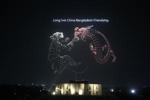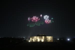 (250415) -- DHAKA, 15 abril, 2025 (Xinhua) -- Imagen del 14 de abril de 2025 de un espectáculo de drones...