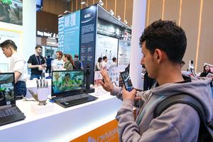 (250416) -- GUANGZHOU, 16 abril, 2025 (Xinhua) -- Imagen del 15 de abril de 2025 de compradores observando las presentaciones...