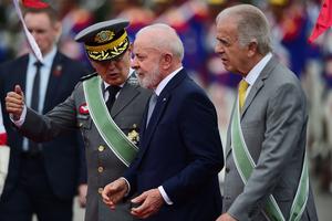 (250416) -- BRASILIA, 16 abril, 2025 (Xinhua) -- El presidente brasileño, Luiz Inácio Lula da Silva (c), el comandante del...