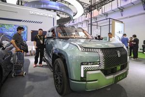(250416) -- HAIKOU, 16 abril, 2025 (Xinhua) -- Visitantes observan un vehículo de nueva energía en la V Exposición Internacional...