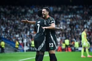 (250417) -- MADRID, 17 abril, 2025 (Xinhua) -- Imagen del 16 de abril de 2025 de Bukayo Saka (i), de...