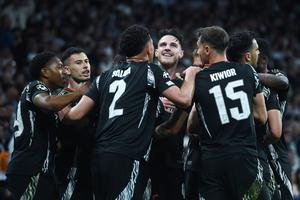 (250417) -- MADRID, 17 abril, 2025 (Xinhua) -- Imagen del 16 de abril de 2025 de jugadores de Arsenal festejando...