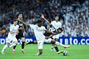(250417) -- MADRID, 17 abril, 2025 (Xinhua) -- Imagen del 16 de abril de 2025 de Aurelien Tchouameni (i-frente), de...