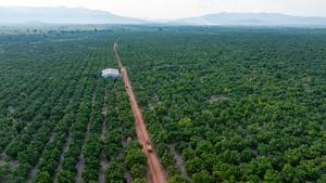 (250417) -- KAMPONG SPEU, 17 abril, 2025 (Xinhua) -- Vista aérea tomada con un dron el 18 de marzo de 2025 de una huerta de mango, en el distrito de Phnom Sruoch, en la provincia de Kampong Speu, Camboya. En el distrito de Phnom Sruoch, en el oeste de Camboya, la abundante luz solar, las lluvias abundantes y la tierra fértil proporcionan las condiciones naturales ideales para el cultivo del mango, que produce mangos de pulpa tierna y rico aroma. En la fábrica procesadora de mangos, con inversión y construida por Zhong Bao (Fujian) Food Science & Technology Co. Ltd. de China, en el distrito de Phnom Sruoch, en el oeste de Camboya, los mangos maduros se someten a procesos como lavado, pelado, rebanado, curado con azúcar y secado, transformándose finalmente en rebanadas de mango deshidratado, dulces y masticables. (Xinhua/Cheong Kam Ka) (rtg) (ra) (vf)