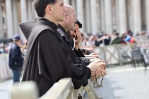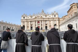 (250421) -- ROMA, 21 abril, 2025 (Xinhua) -- Devotos se lamentan por el papa Francisco frente a la Basílica de...