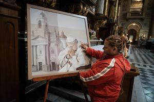 (250421) -- BUENOS AIRES, 21 abril, 2025 (Xinhua) -- Una mujer toca un retrato del papa Francisco, en la Basílica...