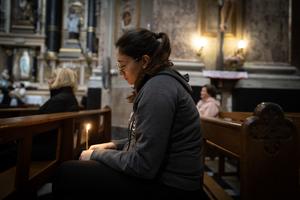(250421) -- BUENOS AIRES, 21 abril, 2025 (Xinhua) -- Una mujer sostiene una vela encendida en la Basílica de San...