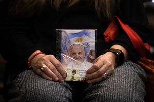 (250421) -- BUENOS AIRES, 21 abril, 2025 (Xinhua) -- Una mujer sostiene un retrato del papa Francisco, en la Catedral...