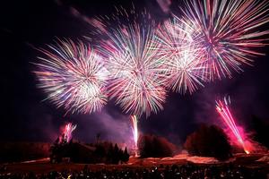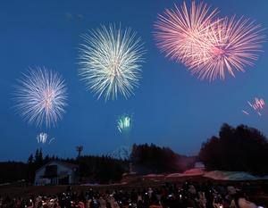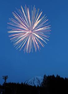 (250419) -- YAMANASHI, 19 abril, 2025 (Xinhua) -- Fuegos artificiales iluminan el cielo durante un espectáculo de fuegos artificiales llevado...