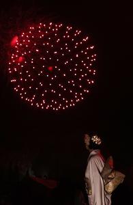 (250419) -- YAMANASHI, 19 abril, 2025 (Xinhua) -- Una mujer observa fuegos artificiales durante un espectáculo de fuegos artificiales llevado...