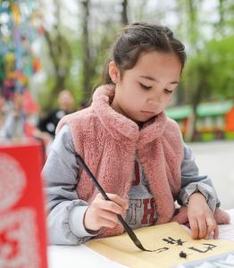 (250419) -- ALMATY, 19 abril, 2025 (Xinhua) -- Una niña aprende a escribir caracteres chinos en el evento del Día...