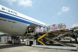 (250420) -- YANGON, 20 abril, 2025 (Xinhua) -- El séptimo lote de suministros de ayuda humanitaria de emergencia enviados por...