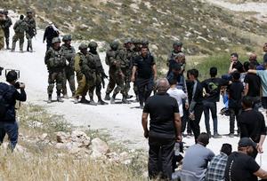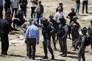 (250418) -- HEBRON, 18 abril, 2025 (Xinhua) -- Palestinos se confrontan con soldados israelíes durante una manifestación contra la confiscación...