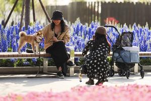 (250418) -- SHANGHAI, 18 abril, 2025 (Xinhua) -- Una mujer posa para fotografías con un perro mascota frente a flores...