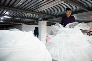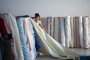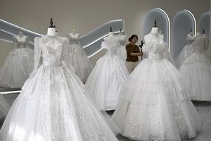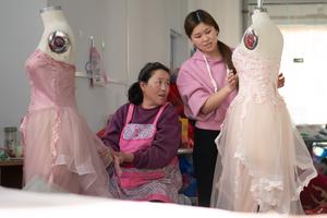 (250421) -- LU'AN, 21 abril, 2025 (Xinhua) -- Imagen del 15 de abril de 2025 de una empleada promocionando vestidos...
