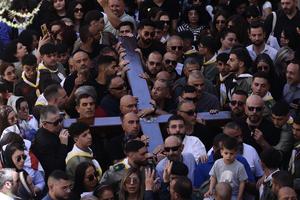 (250418) -- JERUSALEN, 18 abril, 2025 (Xinhua) -- Peregrinos cristianos cargan una cruz de madera mientras caminan a lo largo...