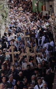 (250418) -- JERUSALEN, 18 abril, 2025 (Xinhua) -- Peregrinos cristianos caminan a lo largo de la Vía Dolorosa (Vía del...