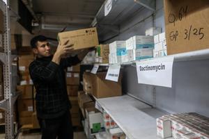 (250418) -- GAZA, 18 abril, 2025 (Xinhua) -- Imagen del 17 de abril de 2025 de un trabajador clasificando medicamentos...