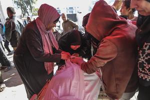 (250418) -- GAZA, 18 abril, 2025 (Xinhua) -- Un cuerpo de un palestino asesinado en un ataque aéreo israelí es...