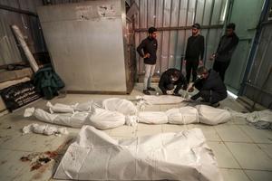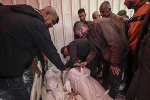 (250418) -- GAZA, 18 abril, 2025 (Xinhua) -- Cuerpos de palestinos asesinados en un ataque aéreo israelí yacen en el...