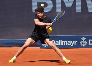 (250420) -- MUNICH, 20 abril, 2025 (Xinhua) -- Imagen del 19 de abril de 2025 de Ben Shelton devolviendo la...