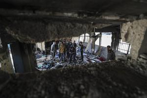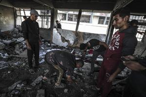 (250417) -- GAZA, 17 abril, 2025 (Xinhua) -- Personas se reúnen en un refugio tras un ataque aéreo israelí en...