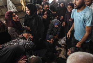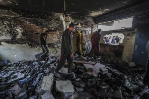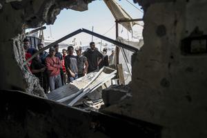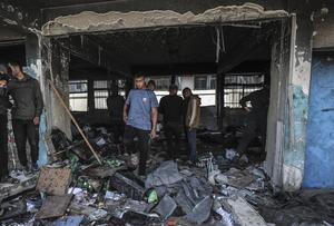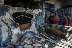 (250417) -- GAZA, 17 abril, 2025 (Xinhua) -- Personas se reúnen en un refugio tras un ataque aéreo israelí en...