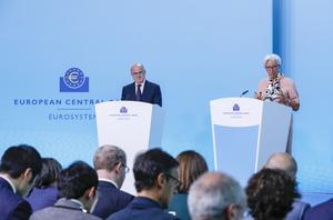 (250417) -- FRANKFURT, 17 abril, 2025 (Xinhua) -- La presidenta del Banco Central Europeo (BCE), Christine Lagarde (d), habla durante...