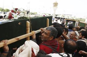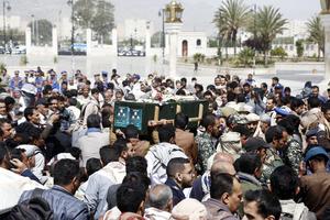 (250417) -- SANA, 17 abril, 2025 (Xinhua) -- Personas asisten a una ceremonia funeraria, en Saná, Yemen, el 17 de...