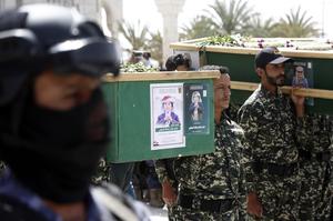 (250417) -- SANA, 17 abril, 2025 (Xinhua) -- Personas cargan ataúdes de las víctimas asesinadas en los ataques aéreos estadounidenses...